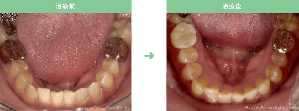 | 治療内容 | 下顎全歯の叢生、左上2番の交叉咬合を治したいという希望があったので、マウスピース矯正装置(クリアコレクト®)により治療した。 |