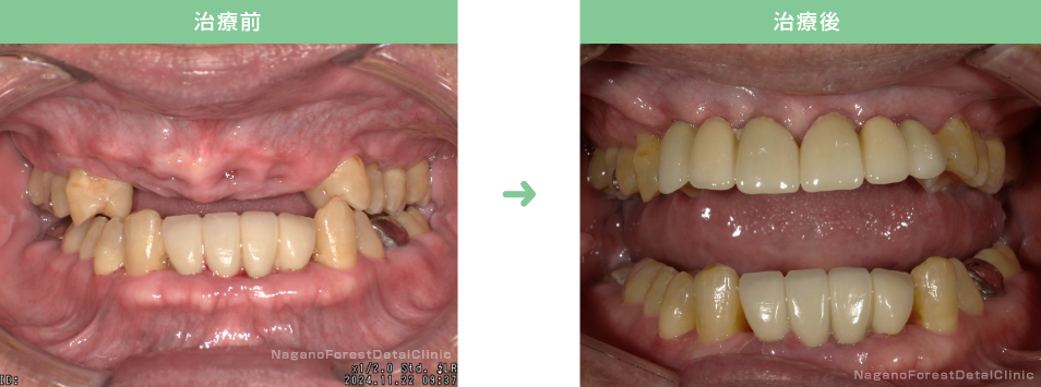 | 治療内容 | 歯周病の進行により右上1番2番3番左上1番3番の抜歯が必要になった。左上2番は元々欠損していた。 抜歯後に斬間義歯を作製し、歯周内科治療のご希望に応じて治療が終了した所で、インプラントを選択された。 1回目の手術で右上1番3番左上1番3番に4本インプラントを埋入した。 3ヶ月後にアバットメントを装着して仮歯にしておき、1ヶ月後に上部構造の型取りをして出来上がったインプラント部ブリッジが装着された。 |